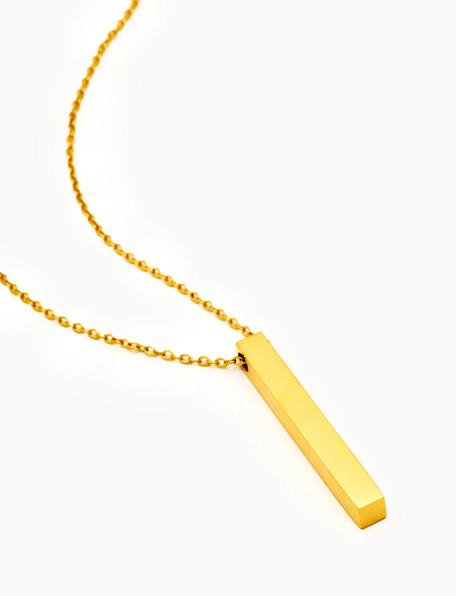 Collana realizzata in acciaio inox ideale per le incisioni. La collana è composta da una catenella sottile e presenta un ciondolo a parallelepipedo in cui scorre la catenella.