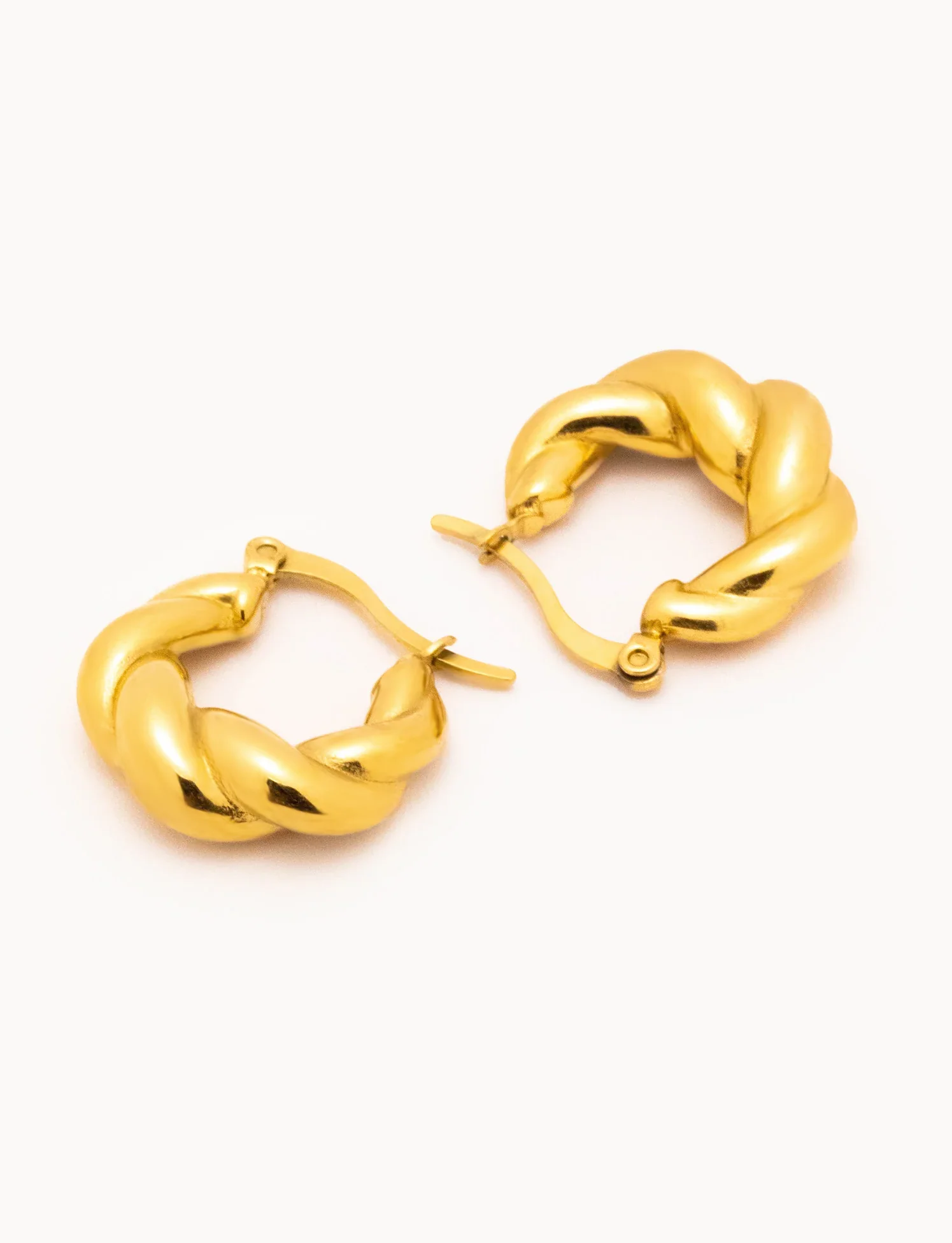 Orecchini a cerchio simil mezza luna arrotolata in acciaio inox che ricorda un croissant.