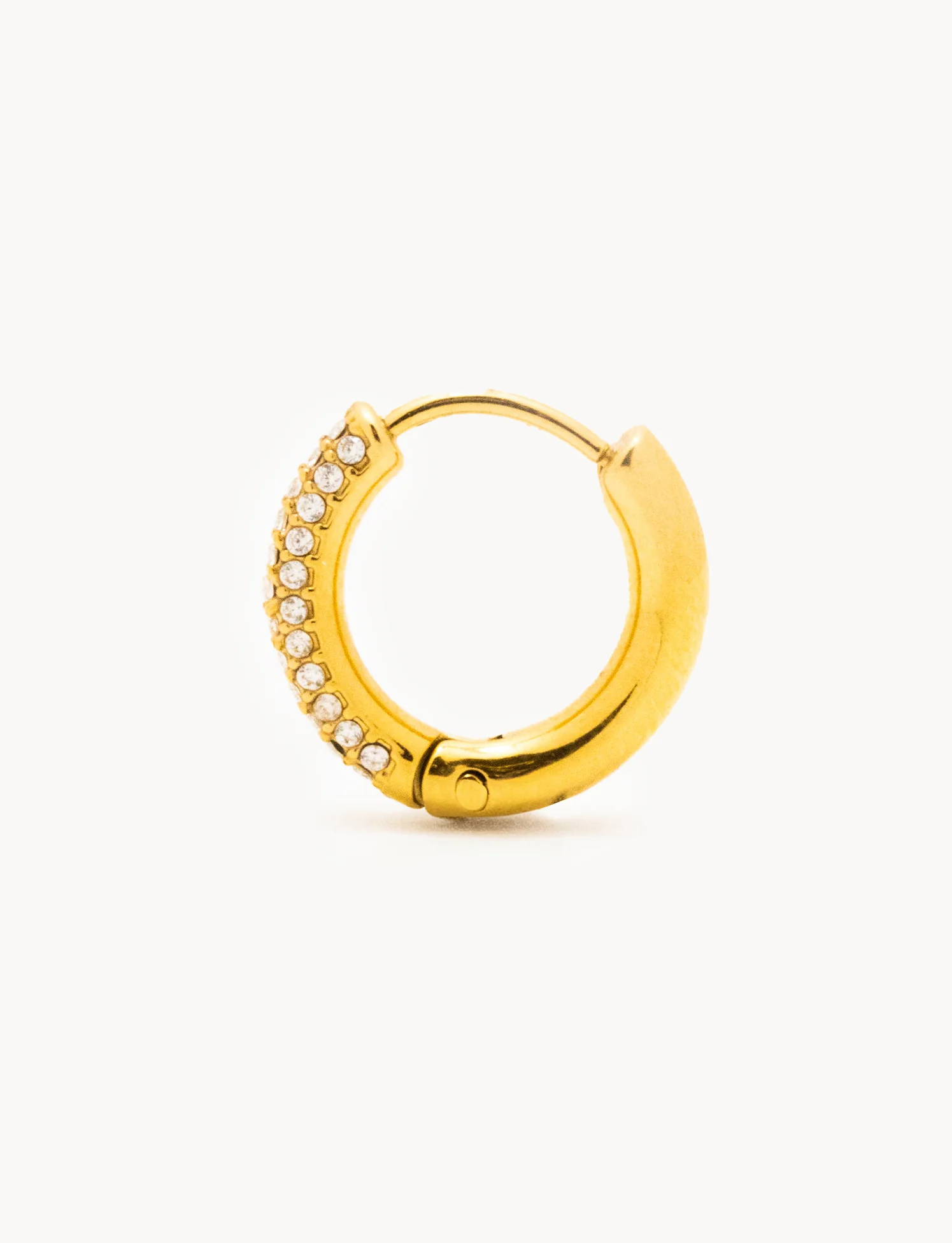 Orecchino a cerchio in acciaio inox dorato dal design elegante e luminoso. La superficie frontale è interamente rivestita da tre file parallele di zirconi trasparenti incastonati a pavé, che donano una brillantezza intensa e un effetto sofisticato. Le dimensioni generose lo rendono protagonista di qualsiasi look, ideale da indossare singolarmente o abbinato ad altri modelli per un mix di stili.